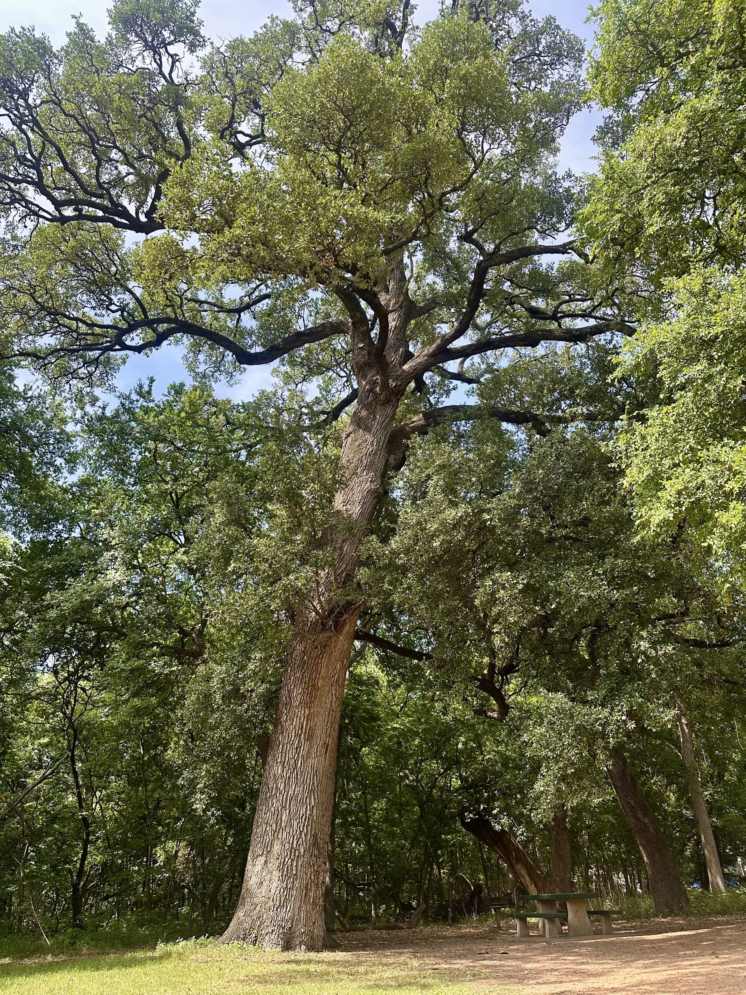 Why Is This Tree Special? Golly gee, look at the size'ov'er! Her branches are so very branchy and she's got a wide chonkiness to 'er. Lovely thicc trunk on this one. This tree is a wonderful picnic spot for anyone looking to keep their car within sight, and the shade is just tops for folks looking to escape the Texas sun. Any arborist that's been caring this for park tree should be very proud. It's a very impressive tree.