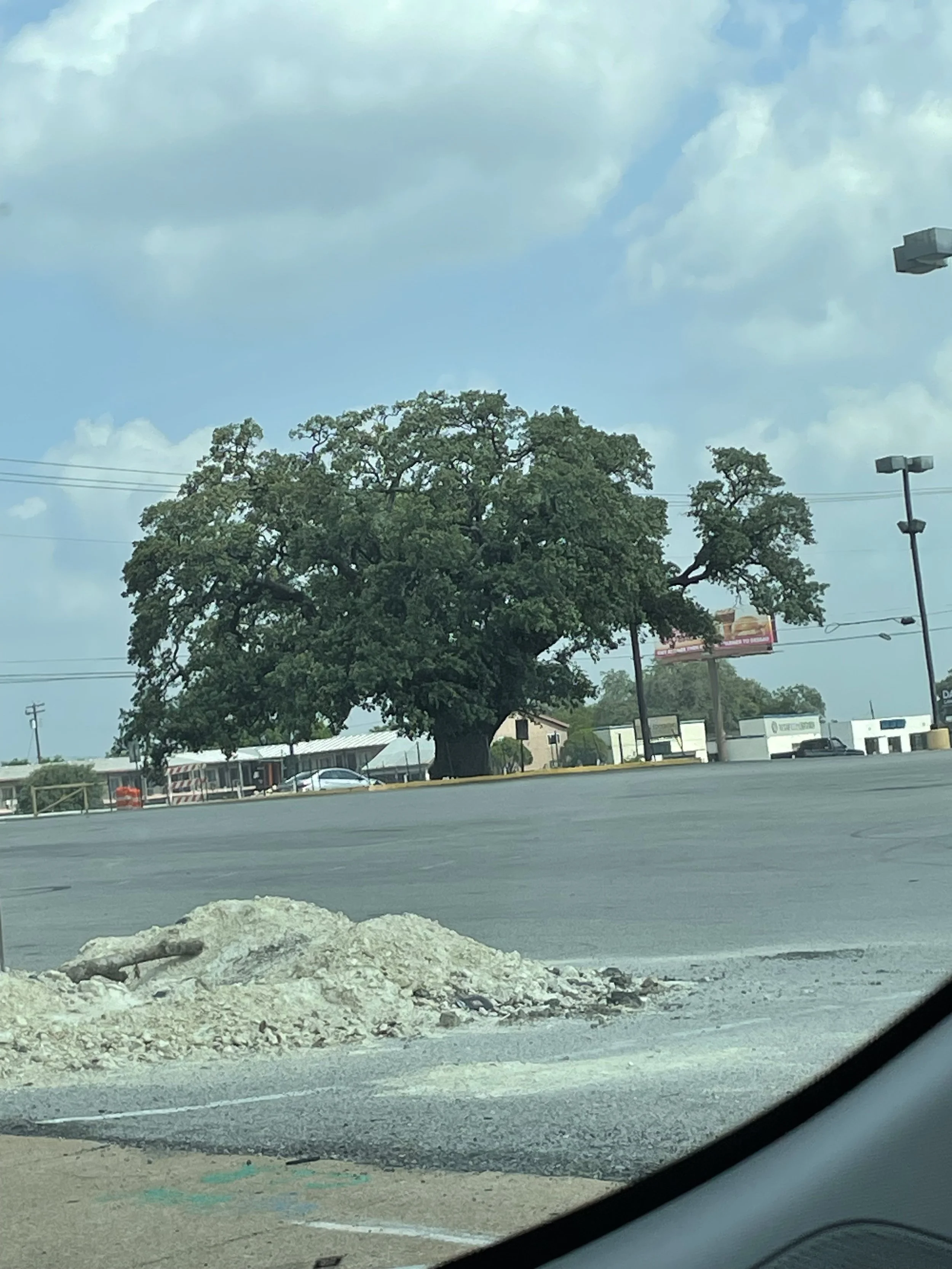 Location: This Escarpment live oak is located behind Sam’s Club at 9300 S I-35 Frontage Rd, Austin, TX 78748, between the loading dock and Slaughter Creek. It sits about 1,000 feet west of I-35, near the Cinemark Southpark Meadows. The tree stands just above the Slaughter Creek floodplain, near a dirt path used by unhoused individuals for access and shelter. It’s in a neglected patch of land surrounded by big-box stores like Walmart, Best Buy, and Target. Once part of native oak savanna and an Indigenous trade route, the site is now overgrown, eroded, and isolated by commercial sprawl. The tree marks a geographic and social edge — where Hill Country meets pavement, and where Austin’s growth has pushed both nature and unhoused people out of sight.