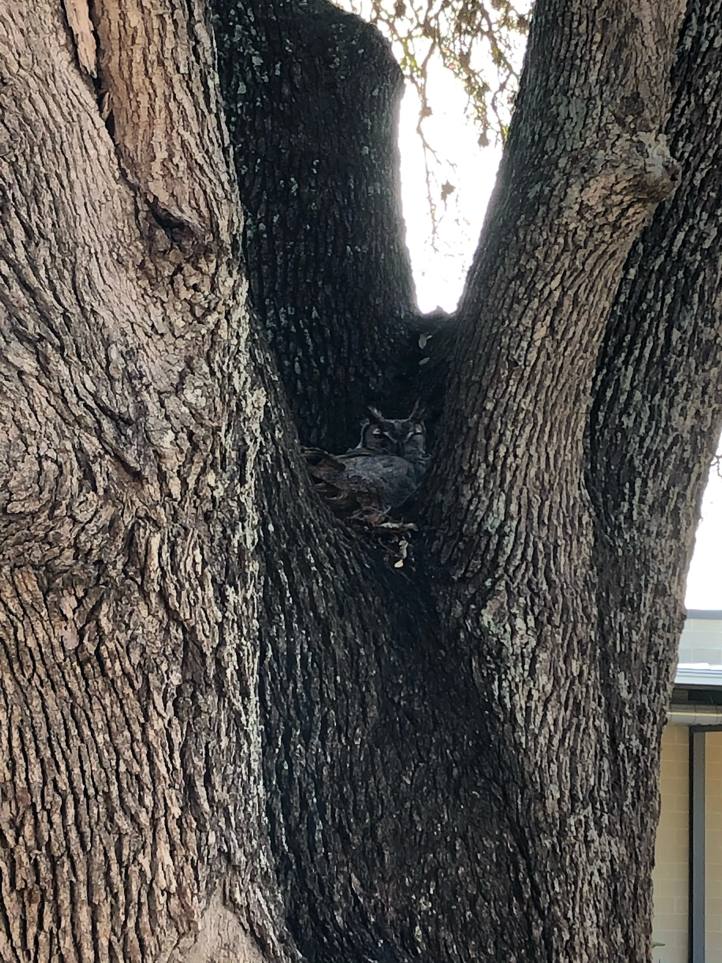 Why Is This Tree Special? This tree was located at the entrance of the track before the rebuild. The kids would huddle under the tree for shade to cool off. This huge tree became the center of the courtyard of the new school. Shortly after opening, we noticed an owl nested near the base. She laid eggs and we all were able to watch her babies grow and learn to fly. It was a very special experience for the kids and staff. This tree provides shelter, shade, and beauty. It’s a special area at this school.